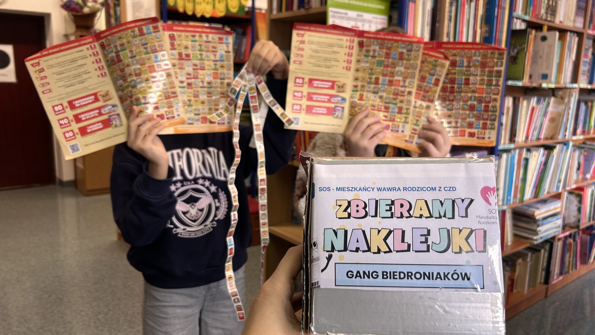 Nasi wolontariusze z zaangażowaniem naklejają naklejki z Biedronki.