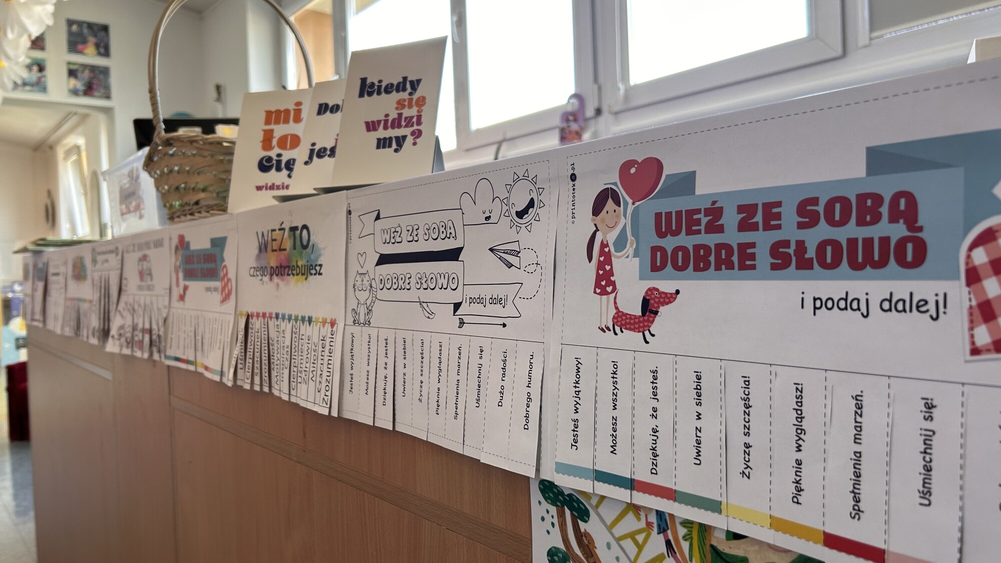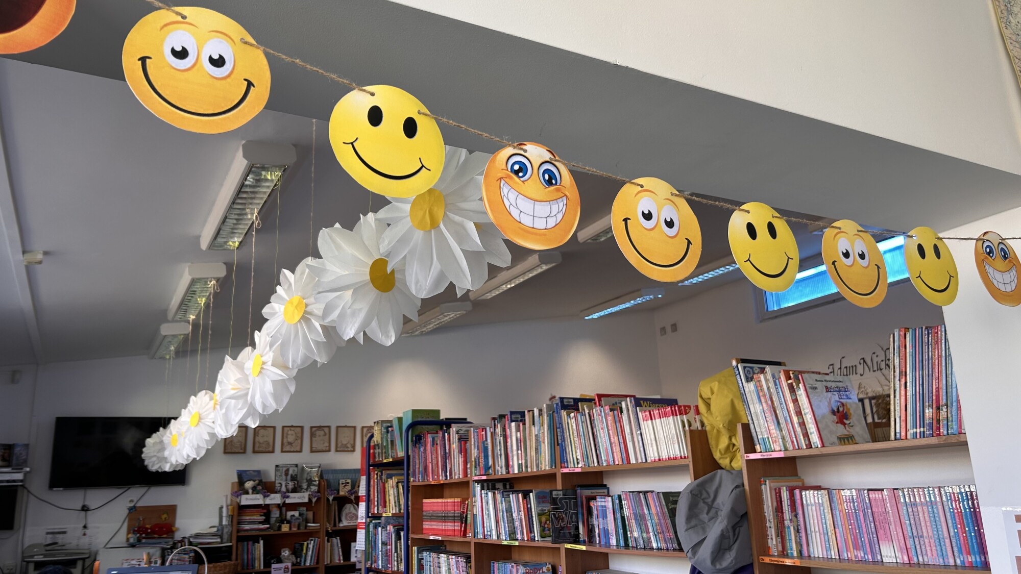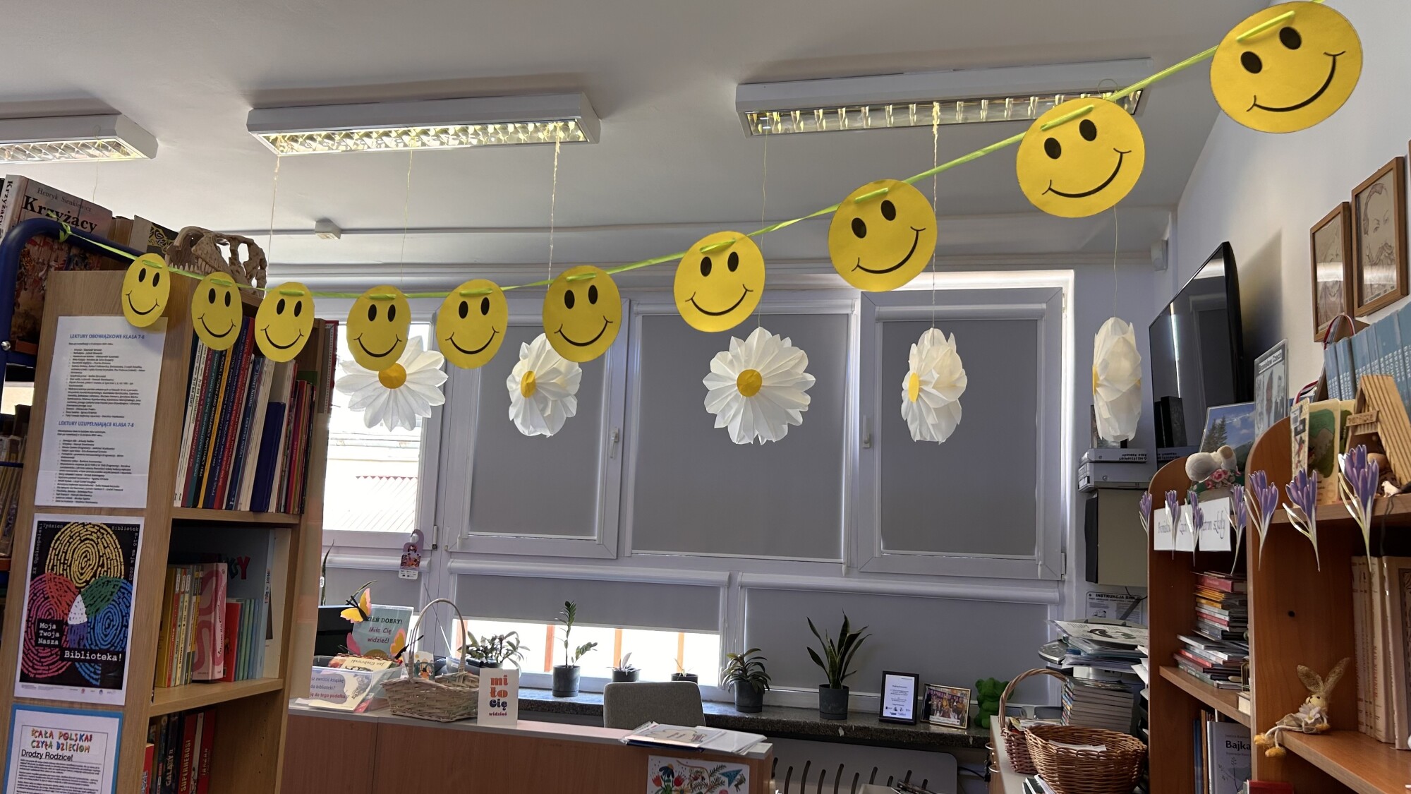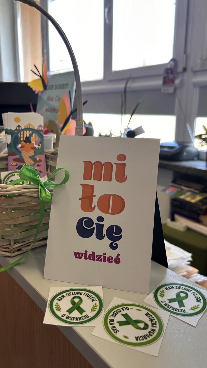 Zadbaliśmy również o przyjazny, wiosenny wystrój – w bibliotece pojawiły się kwiaty, motylki oraz uśmiechnięte buźki. Przestrzeń wypełniły też życzliwe komunikaty, takie jak: „Miło Cię widzieć”, „Dobrze, że jesteś”, „Kiedy się widzimy”, które budowały atmosferę akceptacji i bezpieczeństwa.