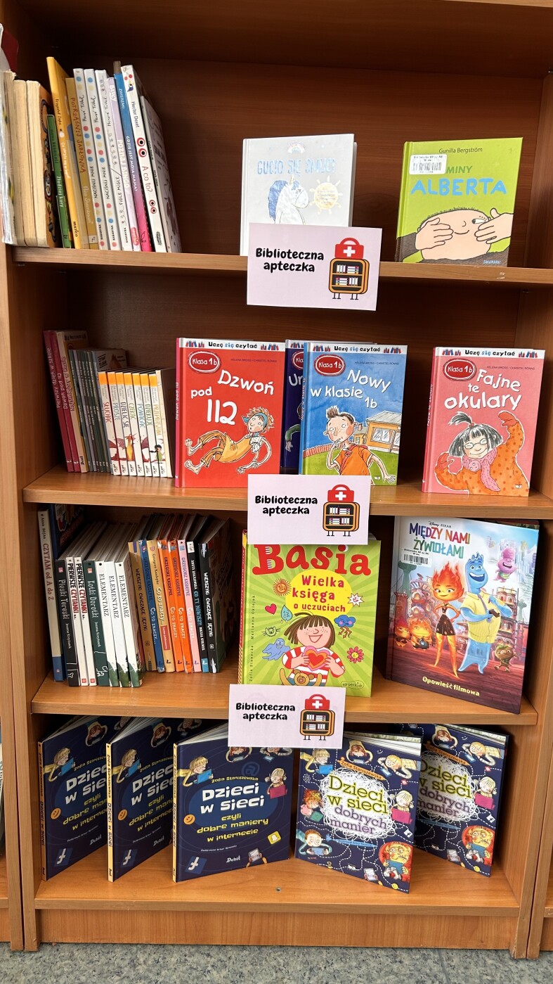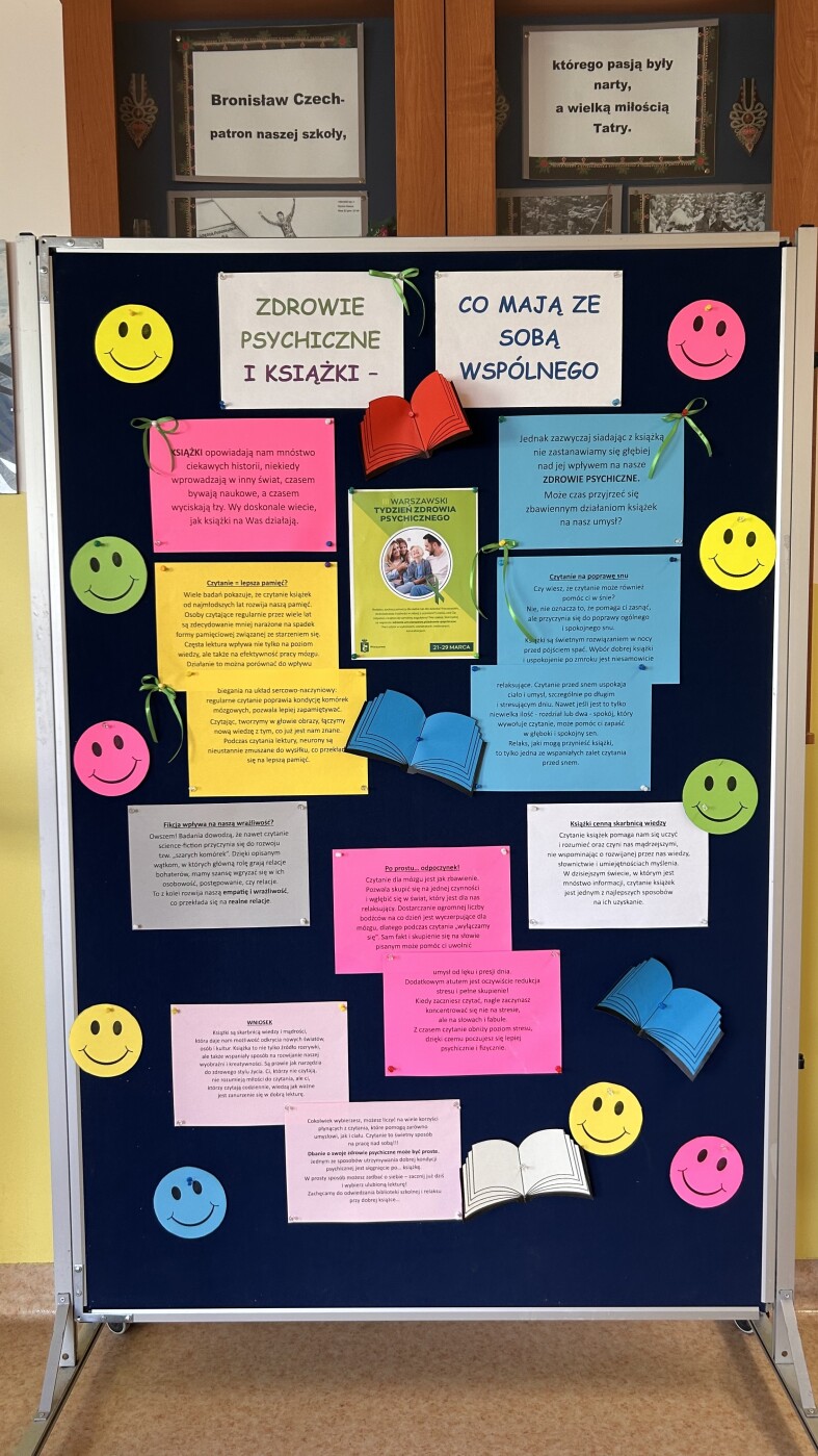 Na korytarzu przed biblioteką pojawiła się gazetka tematyczna „Zdrowie psychiczne i książki – co mają ze sobą wspólnego?”, zachęcająca uczniów do refleksji nad tym, jak czytanie wpływa na emocje, redukcję stresu i rozwój wewnętrzny.