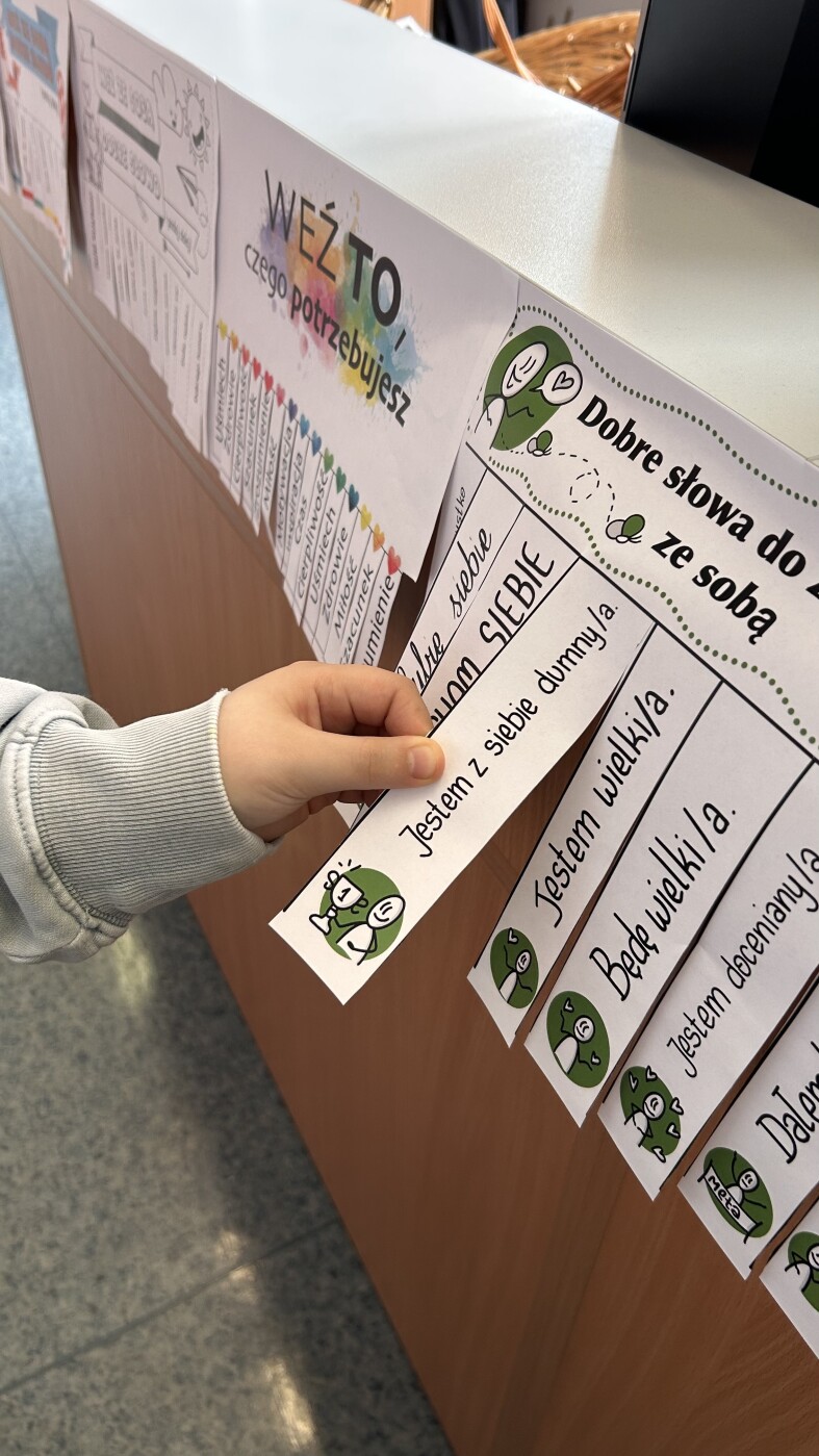 Uczniowie mogli zatrzymać się na chwilę i skorzystać z różnych form odpoczynku: poczytać książkę w wygodnym fotelu przy relaksacyjnej muzyce, założyć słuchawki wyciszające, zagrać w szachy lub inne gry, ułożyć puzzle czy pokolorować motywacyjną zakładkę. Nie zabrakło również miejsca na dobre słowo – każdy mógł zabrać ze sobą pozytywną myśl na dalszą część dnia.