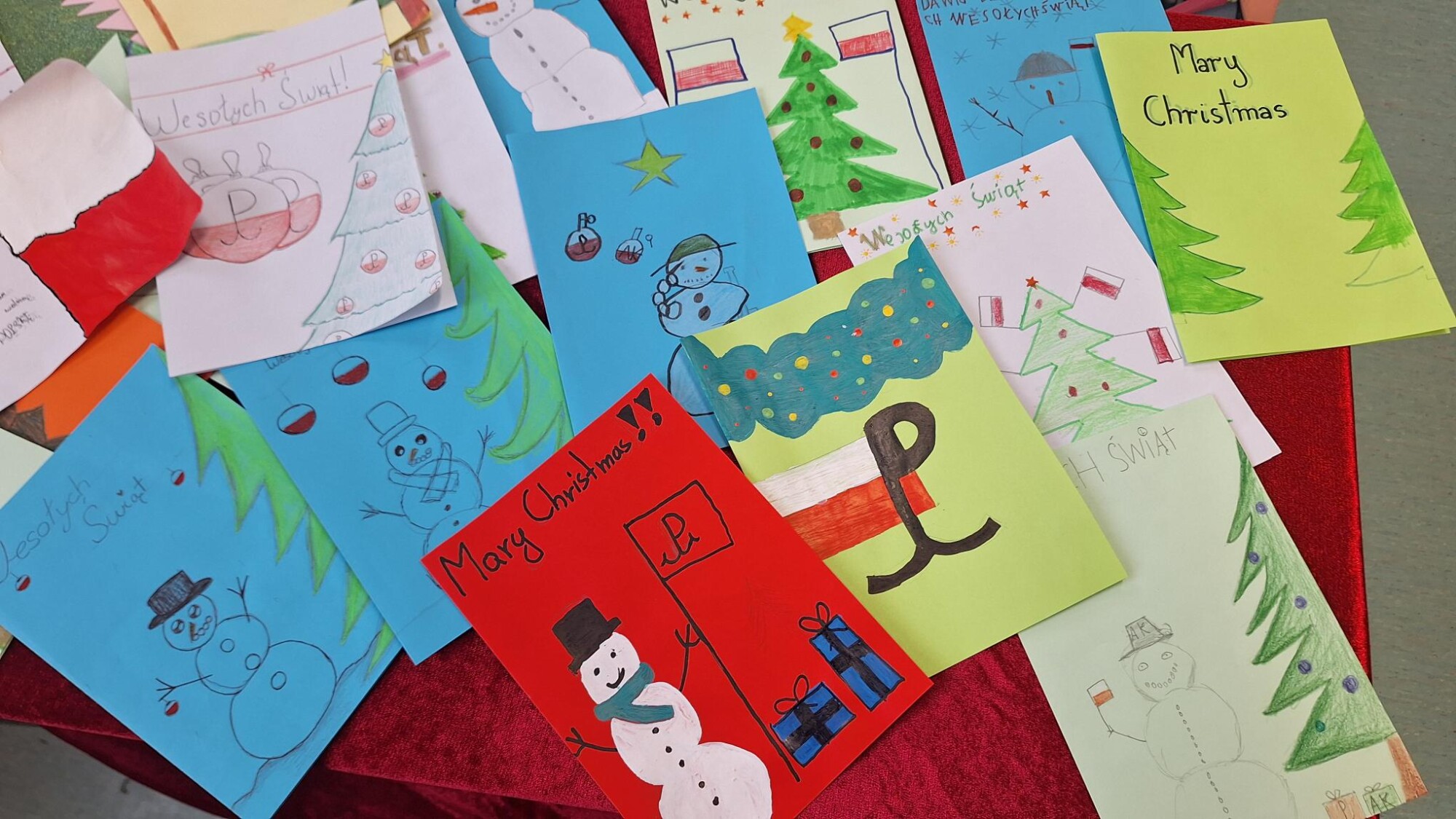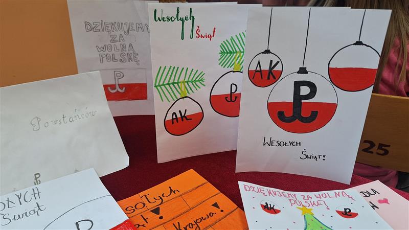 Uczniowie wykonali kartki świąteczne z wdzięczności dla żołnierzy AK, którzy walczyli o wolną Polskę.