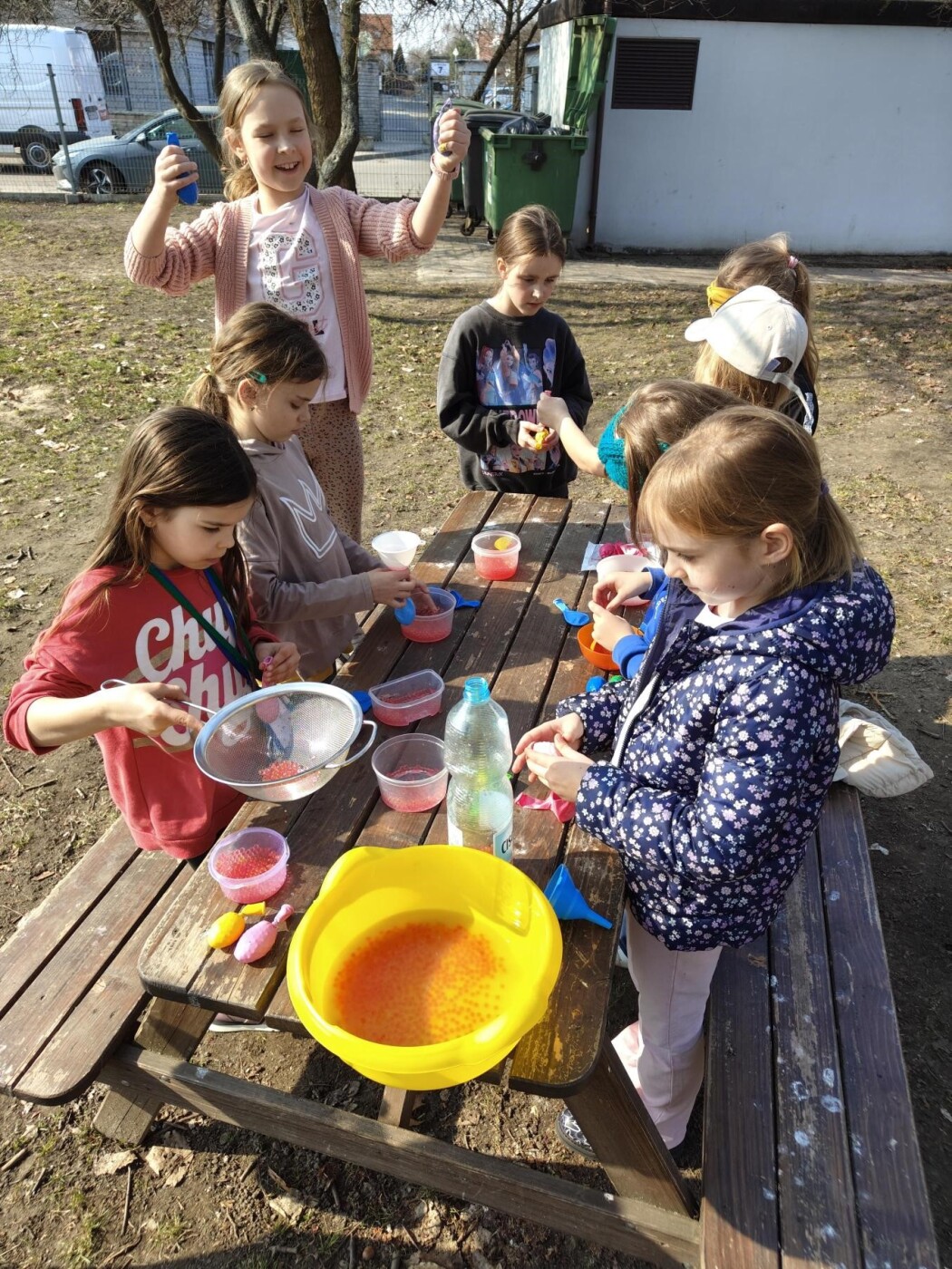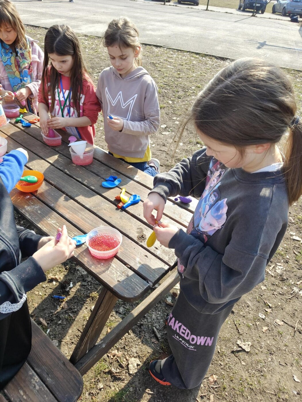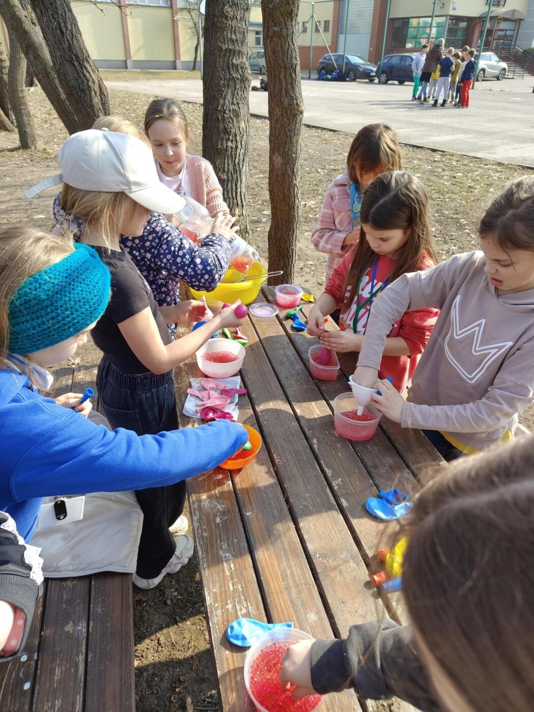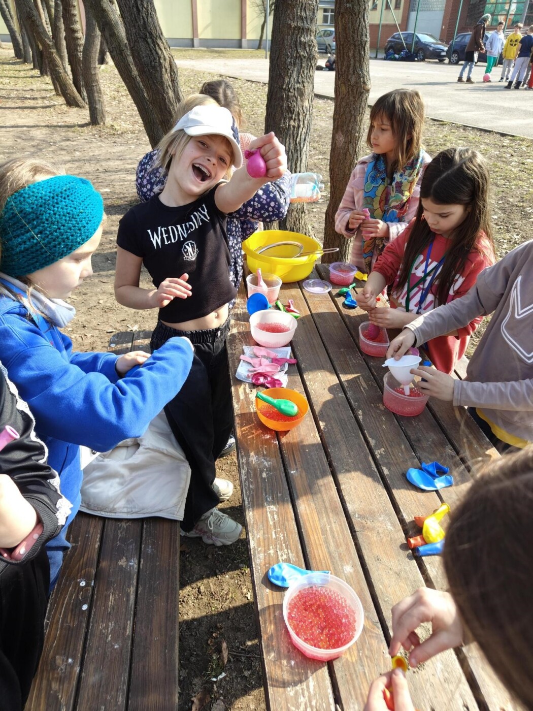 Podczas Tygodnia Zdrowia Psychicznego uczniowie klasy 2c mieli okazję na świeżym powietrzu wziąć udział w kreatywnej aktywności polegającej na tworzeniu gniotków sensorycznych z kulek żelowych oraz balonów. Dzieci z dużym zaangażowaniem i radością przygotowywały swoje własne gniotki, napełniając balony kolorowymi, kulkami, które dostarczały ciekawych wrażeń dotykowych. Zajęcia przebiegały w swobodnej, przyjaznej atmosferze, sprzyjającej integracji i współpracy między uczniami.