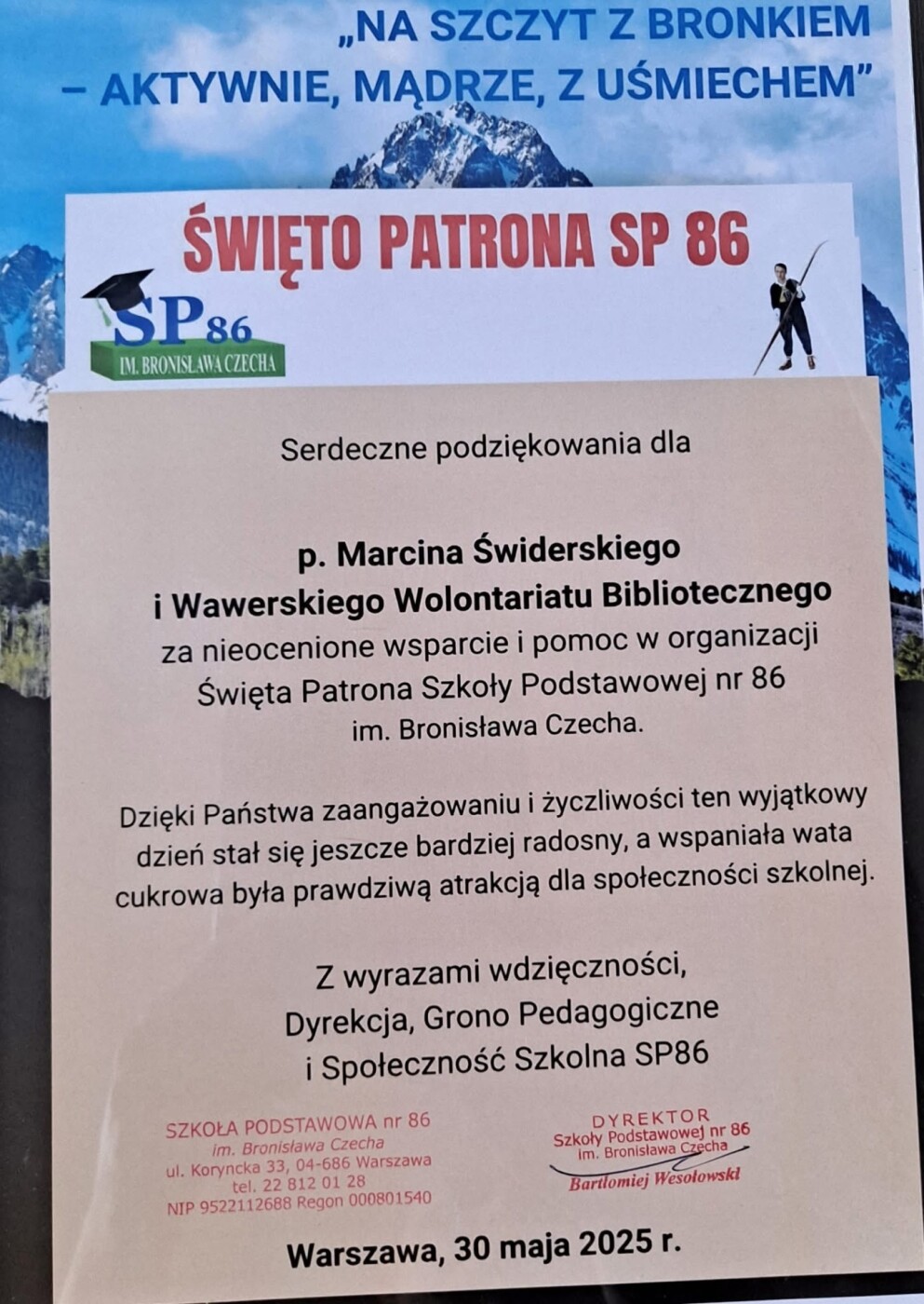 Dziękujemy Dyrektorowi SP 86 Bartłomiejowi Wesołowskiemu, wspaniałej kadrze nauczycieli oraz niezastąpionej Pani Annie Kowalczyk za otwartość, współdziałanie i budowanie lokalnego środowiska opartego na edukacji, kulturze i wzajemnym wsparciu.
